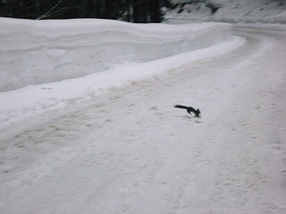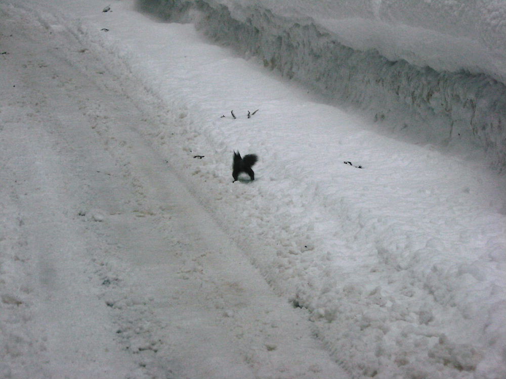 雪道にちっちゃい動物が走るよ、ホンドリスだ雪壁が立って逃げられないんだよな、車中からパチリンコ。