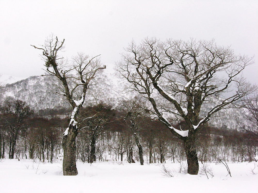 スキー歩行は効率が好いよ、池の平に立つブナ仁王に着く、参道の様に両端に太いブナが並びその上に野伏ガ岳が西端な三角姿で迎えてくれるんだ。