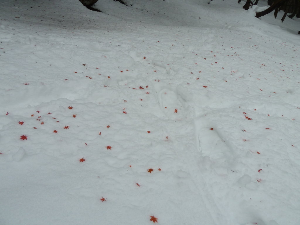 雪面になぜか季節外れの赤い紅葉の葉が散らばっていた。白と赤のコントラストが美しい。