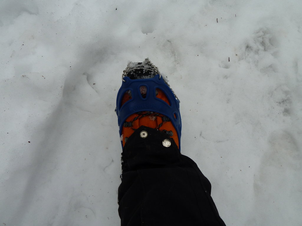 合がいい。アイゼンを着けるまでもないという場面では重宝しそうである。とにかく軽くて小さいのと、一瞬で着脱できると