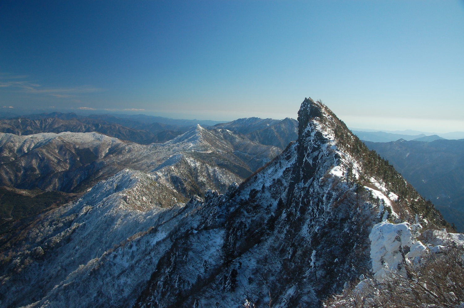 殆どの人は弥山(ここに石鎚神社・頂上山荘がある)までですが、天気もいいのでせっかくなんで天狗岳に向かいます。断崖絶壁ですが無雪期なら鼻歌まじりコース、しかし冬はアイゼンで絶壁の岩場トラバース、真剣に恐怖で下が見えませんでした。アイゼンでのクライミング(特に下り)は苦手なんです。