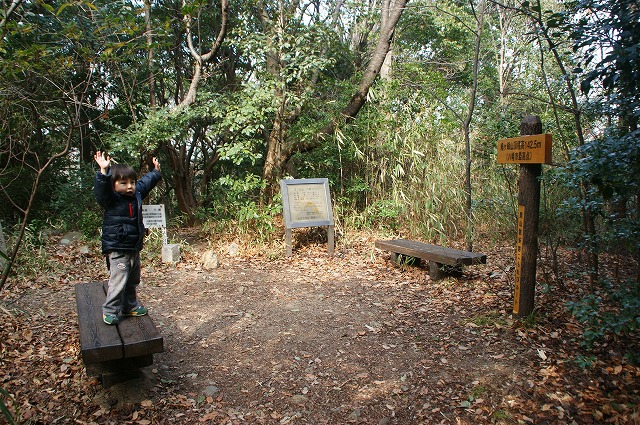 竹林を抜けるとコナラ、クヌギの落葉樹と常緑照葉樹の混生林となる。まあ、そこそこ山っぽい登山道だ。急斜面や岩場もなく子供が歩くには丁度よい路である。落ち葉を蹴飛ばしたり、歌を歌ったりしながら楽しく進んでいく、すれ違う登山者にも大きな声で「こんにちは」とようやく言えるようになった。そうこうしながらやがて三角点に到着した。そばに国分寺跡の標柱もある。 山頂を後にするとすぐに携帯電話?のアンテナがあり、長い階段を降りる。子供はジャンプジャンプで結局両足を揃えてうさぎ跳びしながら全段降りていった。