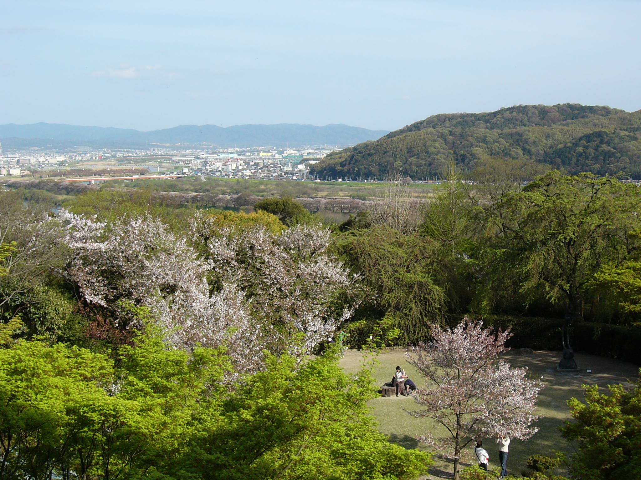 鳩ヶ峰の次のステップアップとして是非対岸の天王山(270m)においでください。こちらも歴史は満載です。また確かにエジソンの電球は八幡市の竹ですが、竹藪の本場はこちらですぞ。我が方の小学校では裏山で筍掘りをするくらいですから。そいでもって次に天王山山麓の大山崎美術館でモネを見て、お茶とケーキをしながら(ビールもある)鳩ヶ峰を眺めるのは実に乙なものです。また芝生の広場もあり天気が良ければお昼を食べることもできます。(下の写真の広場です。)