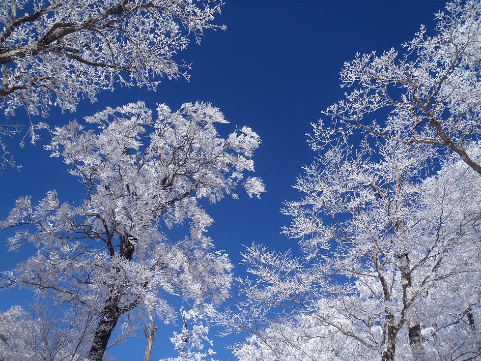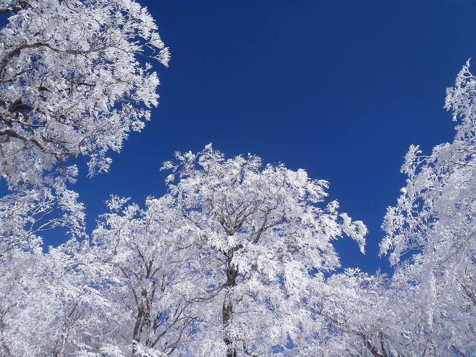 紺碧の空に純白の霧氷が映える。