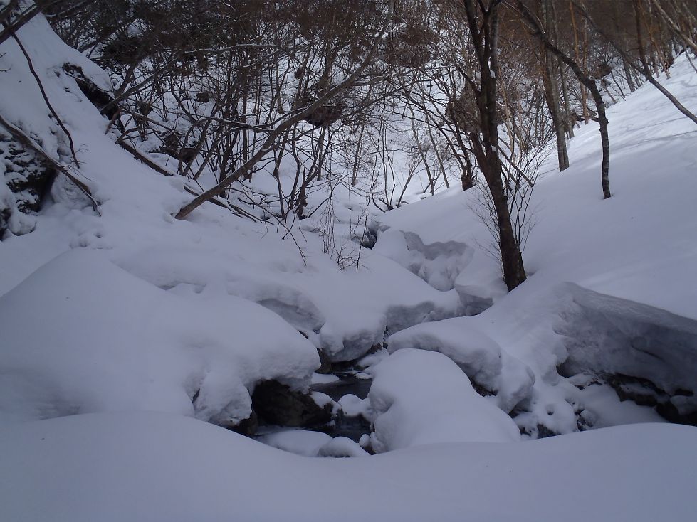 いつもの谷を渡る所は雪の段差で足が上がらない。