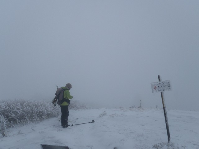 鈴北岳に登ると、ますますガスが濃くなっている。せいぜい10mか20mほどしか視界がない。鈴北岳で今日初めて二人の登山者に会う。どちらも単独行者で、一人は藤原岳から、一人は鞍掛峠から登ってきたという。藤原岳から来た人の足跡を頼りに歩いて行くと、登山道から外れていることが分かる。この時間に藤原から鈴北まできたとすると、テーブルランドへは行っていないであろう。テーブルランド方向にはトレースがついていない。もしトレースがないと、このガスの中、迷いかねない。GPSがあれば大丈夫だが、もしバッテリーが消耗してしまうと、困ったことになる。