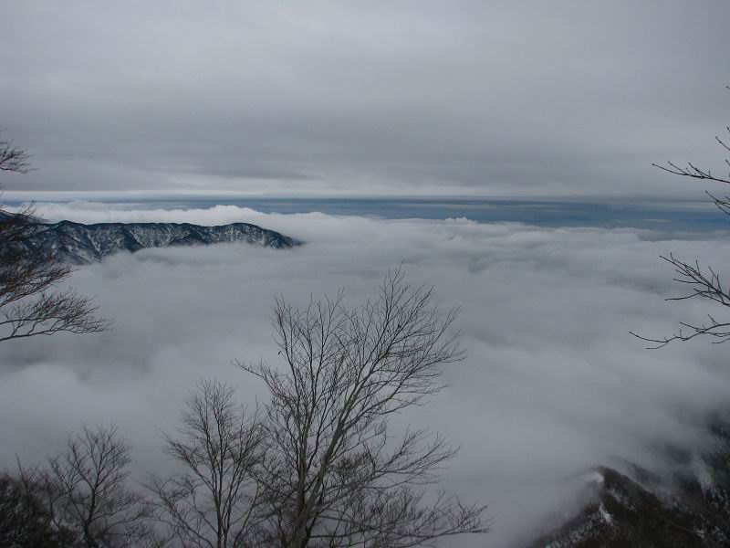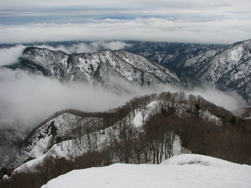 どうも登山道とは思えない尾根である。藪はないが切り開きもなく、目印もない。雪の上のトレースもない。けやき広場と思われるケヤキの大木を確認。ひたすら黙々と高度を上げる。やがて展望が開けてきた。山の名はさっぱりだが、所々ガスが棚引いてピーカンとは違う味わいがある。望外の好景だ。