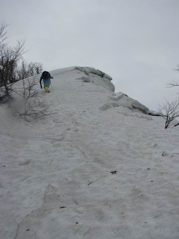 積雪は尾根の北側は薄いが、南側は雪庇状で数メートルある。だんだん踏み抜きは減ってきた。今日はツボである。I君と相談の上、アイゼンもワカンも要らないと判断。男は黙ってツボじゃ!・・・と言いつつ、荷物が増えることを何より嫌う二人の意見が一致したのであった。実際この判断は当たりであった。急斜面ではアイゼンがあった方が多少楽だとは思うが、靴を蹴り込めば登れるのである。