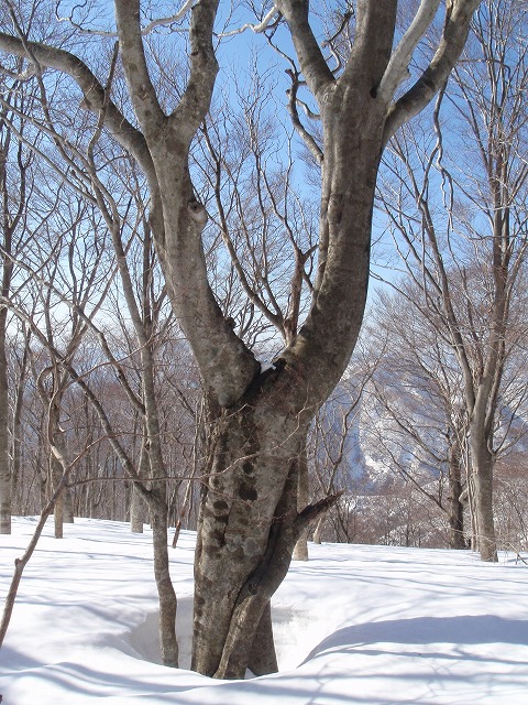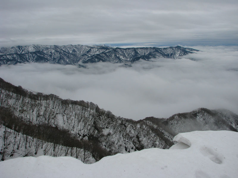 やがてブナが多くなり、そこそこ太いものも見られる。少しの踏ん張りで稜線のT字路に到達し、北側の絶景にしばし見とれた。青空はないが予報の悪い中、ここまで見えれば御の字である。ここでようやく雪の上に微かなスノーシューの痕跡をみる。地図では山頂はすぐ東なのだが、それらしきものは見えない。