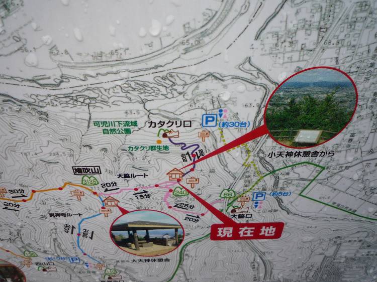 小天神の東屋からも展望が良い。ついでになぜかコンビニはないかとみんなで探す。ここから急降下の登山道を下る。さあお目当てのカタクリの群落地へとどんどん下る。