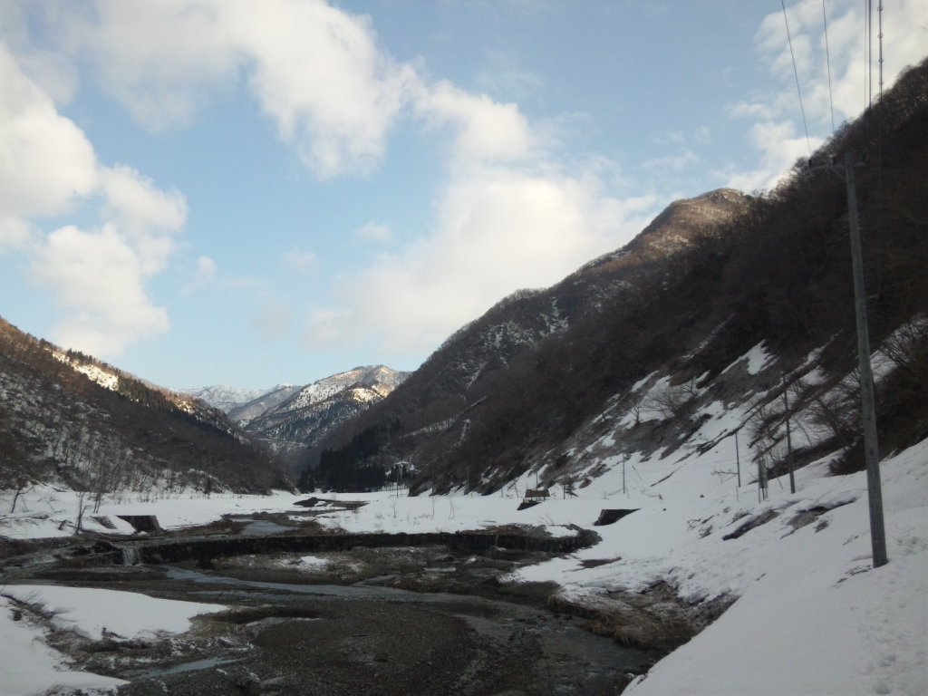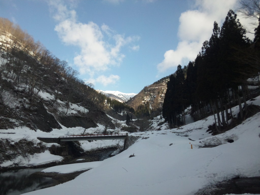 遠く振り仰ぐ坂内川の上流には高丸から烏帽子へと続く稜線が白く輝いていた。