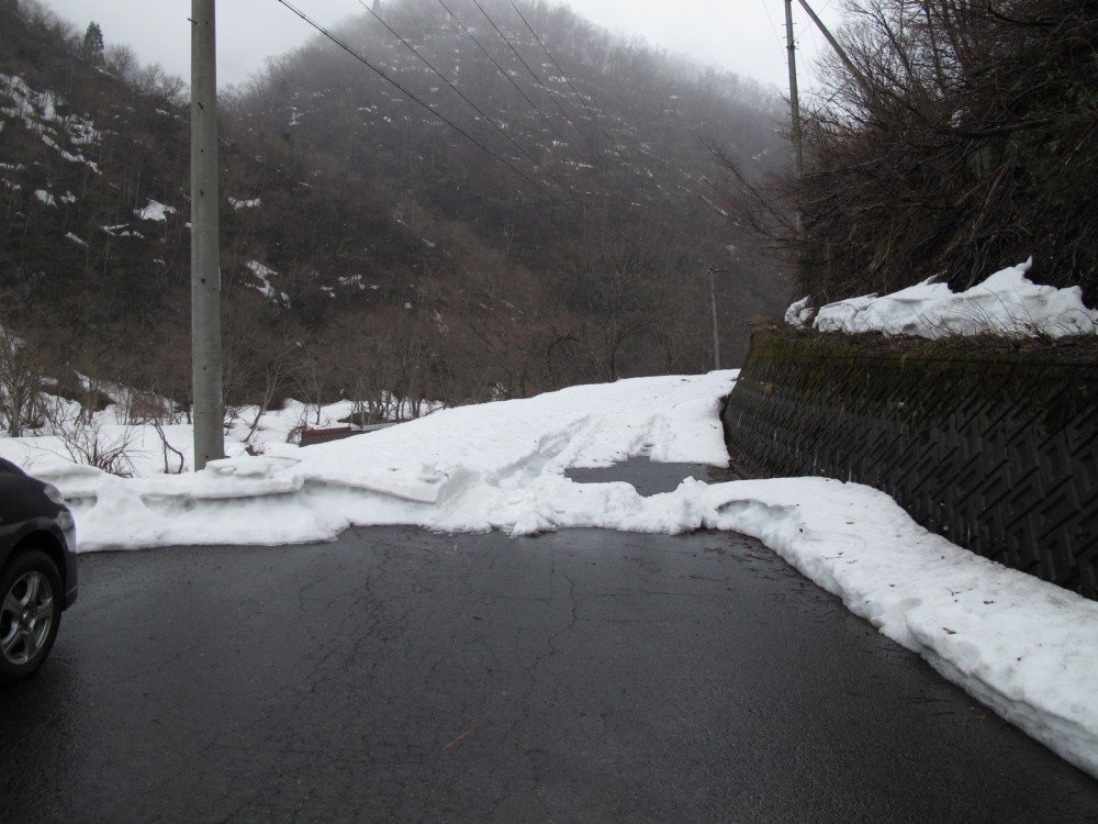 林道は雪に覆われているものの、路肩部分では雪が融けて道路が露出しているところもあった。この林道の核心部