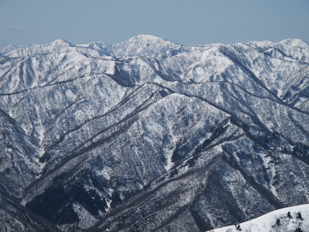 烏帽子から眺めると、手前の不動・千回沢と一番後ろの部子山・銀杏峰に挟まれて目立ちにくいんですよね。