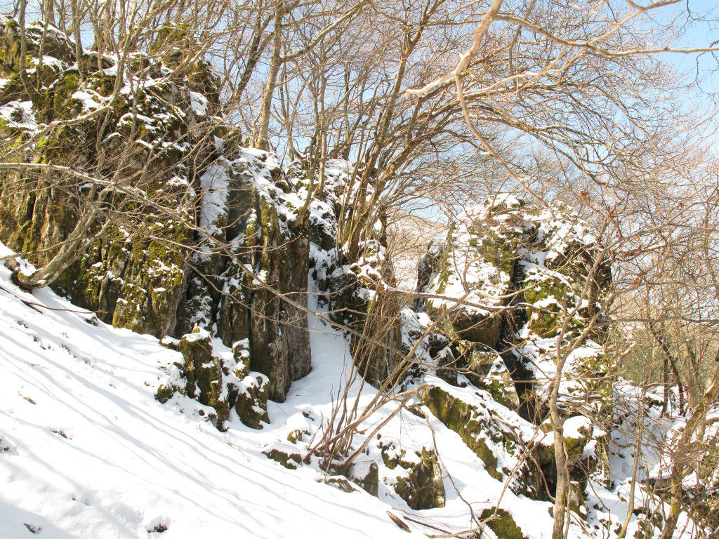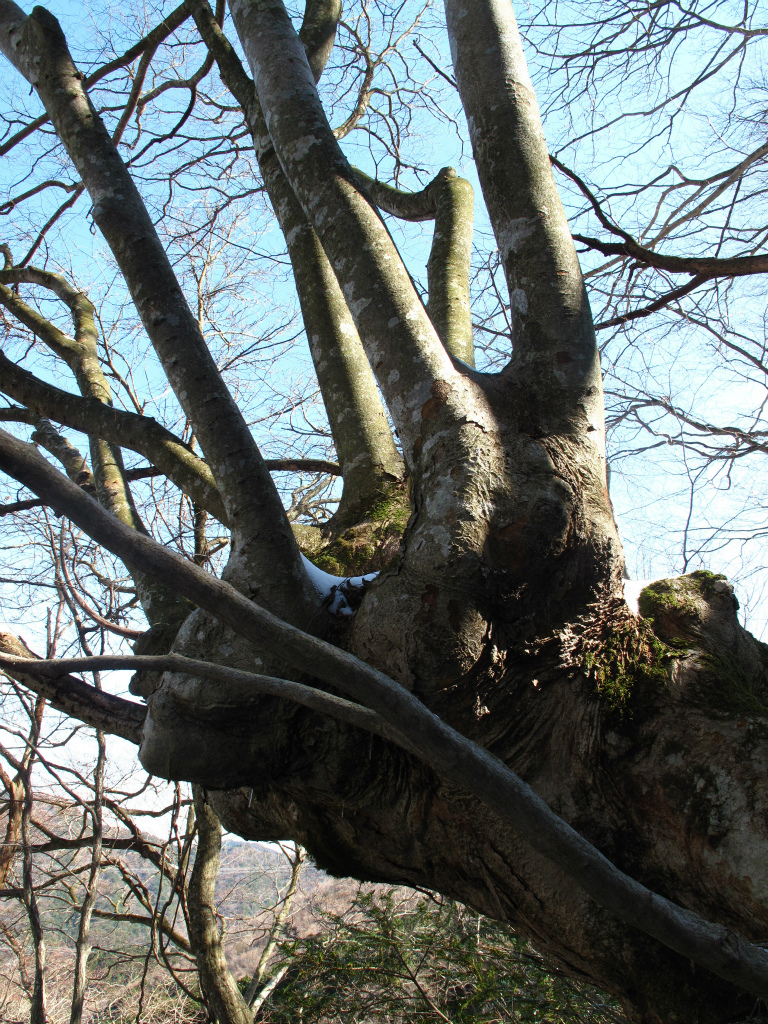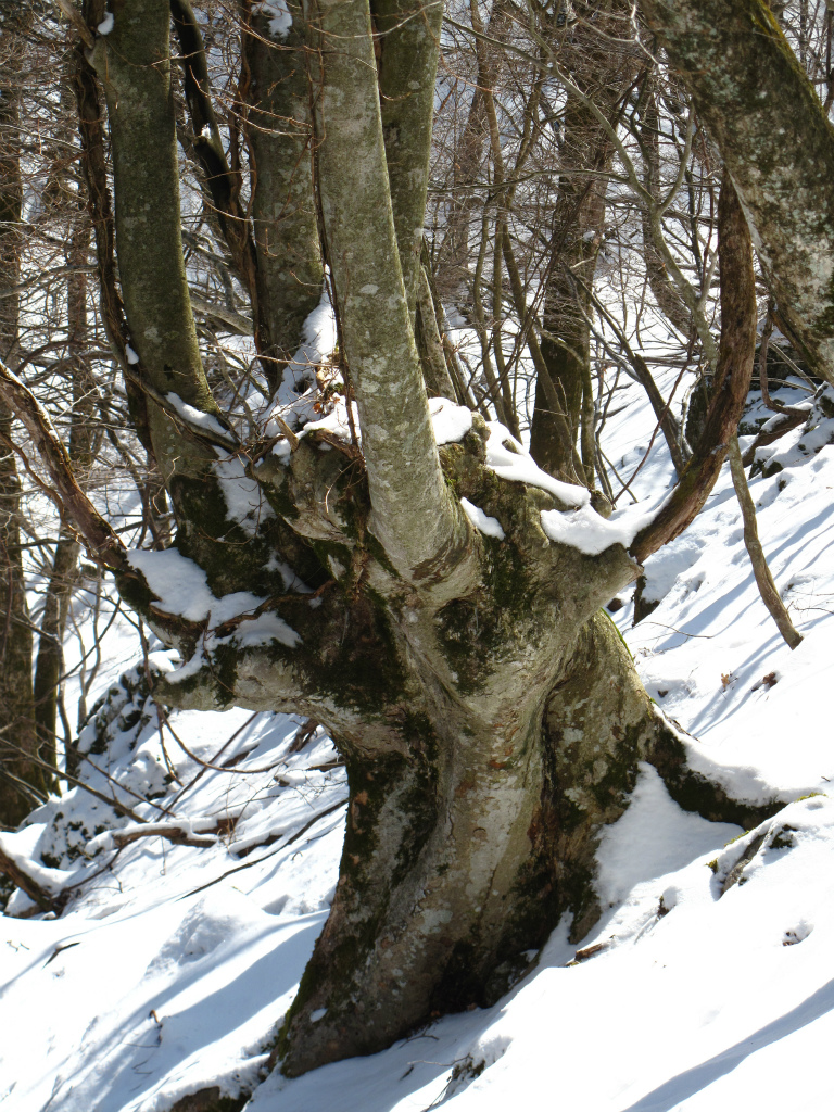 先週末の雪が積もった歩きにくい尾根を上ると早速ケアキのあがりこが顔を出す。あがりこは、大木の下部を残して伐採して切り口から生えてくる木を薪として繰り返し使う先人の知恵で、今回上るネコマサノクラの尾根には特に多く残されている。