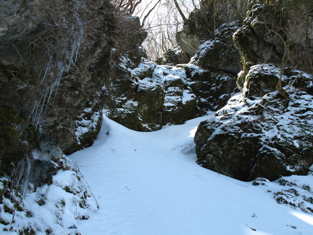 ここでアイゼンを着けた。アイゼンとピッケルを使いタヌクラの入口に上がっていくと、入口は嵓の上から流れてきた雪でふさがれていた。どうやら冬季は休業のようだ。