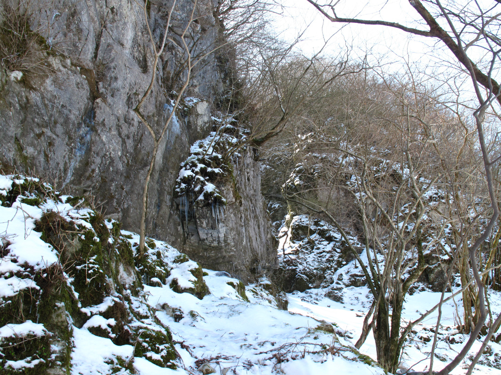 さて、トラバースにかかると日の当たる新雪の下は濡れた落ち葉と泥でトラバース出来ない。しかたがないので谷まで下り、そこからタヌクラに向かって上ることにする。谷を上っていくと雪がしまってきたのはいいのだが、タヌクラの手前は凍っている。雪がしまるにしたがい新雪の下の雪をキックしても上手く上れなくなってきたので、ここでアイゼンを着けた。アイゼンとピッケルを使いタヌクラの洞窟入口に上がっていくと、入口は嵓の上から流れてきた雪でふさがれていた。どうやら冬季は休業のようだ。 厄介な残雪ですねぇ。