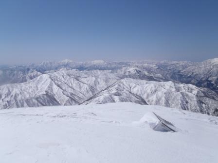 両側を確認しながら谷筋を上るがきれいな雪原が広がるのみ。週末もそこそこ降ったようでなかなか確認がしづらい状況だった。例年に比べ雪の量が多く、おまけに4月になってからの雪とは困ったもんだ。特に滋賀県側の北面にはしっかり雪が残っていた。隣の尾根に移ると霊仙、伊吹はもとより御嶽までも見えていた。とてもいい天気だ。緩やかな尾根を上ると鈴北岳の頂上に到着。予想はしていたがたくさんの人がいた。頂上を少し下りた所に捜索隊の皆さんもみえたので、今日の歩いたルートとヤブコギにレポを上げる事を告げて別れた。捜索隊のみなさんも新雪で捜索がしずらかったようだ。