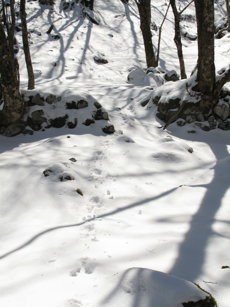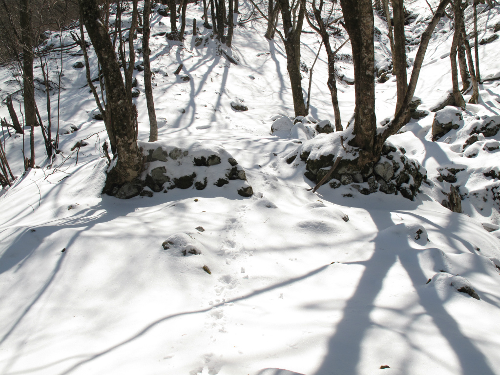 そこも探ってみましたが雪の厚み約50センチはありそうで転戦。斜面を這い、木の根につかまりながら右の小尾根に逃げて、登るとしばらくして雪の上に踏み跡が現れました。