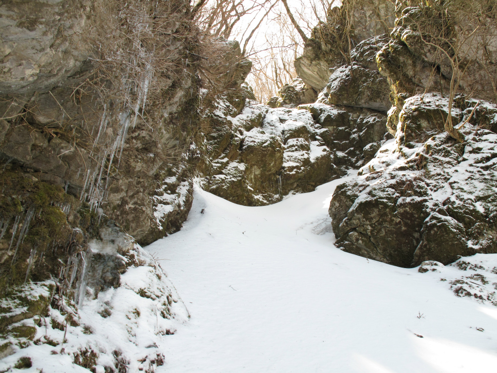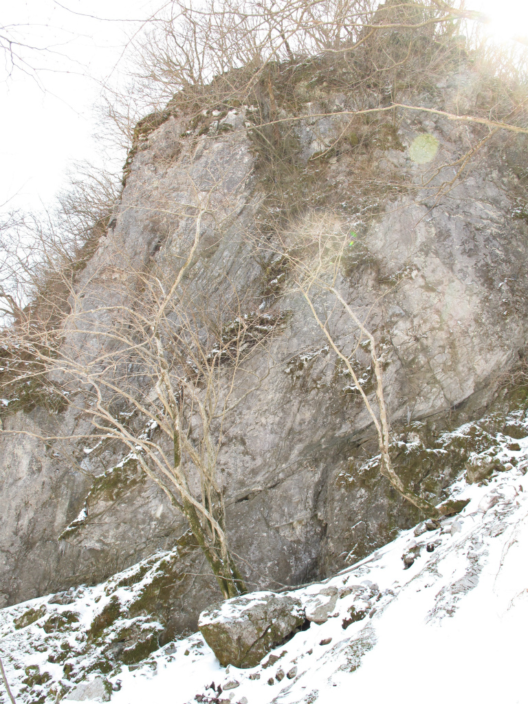 さて、トラバースにかかると日の当たる新雪の下は濡れた落ち葉と泥でトラバース出来ない。しかたがないので谷まで下り、そこからタヌクラに向かって上ることにする。谷を上っていくと雪がしまってきたのはいいのだが、タヌクラの手前は凍っている。雪がしまるにしたがい新雪の下の雪をキックしても上手く上れなくなってきたので、ここでアイゼンを着けた。アイゼンとピッケルを使いタヌクラの洞窟入口に上がっていくと、入口は嵓の上から流れてきた雪でふさがれていた。どうやら冬季は休業のようだ。