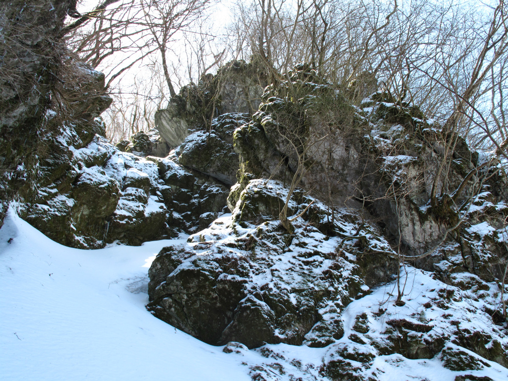 この尾根は石灰岩で出来たカレンフェルトの尾根で岩柱がそこかしこにある。木とカレンフェルトを頼りに上って行くと多くのあがりこ達が出迎えてくれた。以前来たときには気づかなかったが、尾根の両側の谷は厳しい斜面で獣すら歩いていない。その分、この尾根は獣くん達御用達でよく歩かれている。おまけに獣達の寝床も何か所か残っていた。