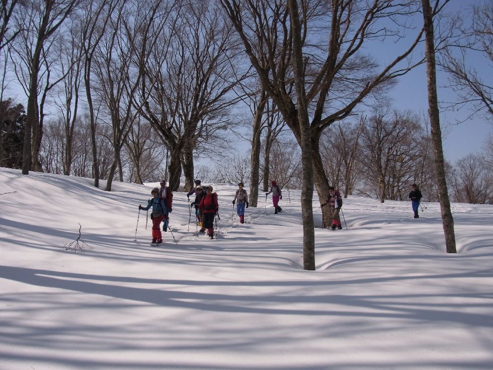 初めて訪れた雪の谷山は広々とした雪原にブナ等の木が疎らに生える美しい所でした。スコップでテーブルをつくり、雪山歩きを始めたばかりの仲間とのんびりと昼食をとりました。