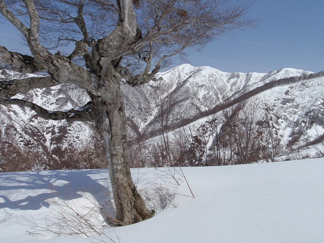 ここから見る左千方は中々魅力的な山容をしていましたが、谷を分ける尾根の取り付きは既に黒々とした地肌が見えており、これらの尾根を訪れるのは来シーズンの楽しみになりそうです。なだらかなこの尾根もブナが多くいい尾根です。
