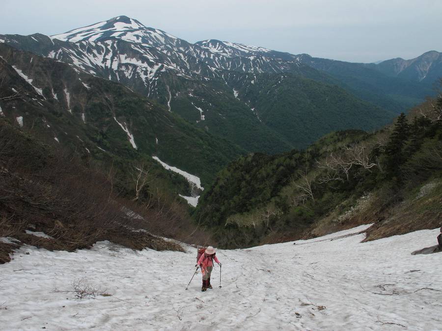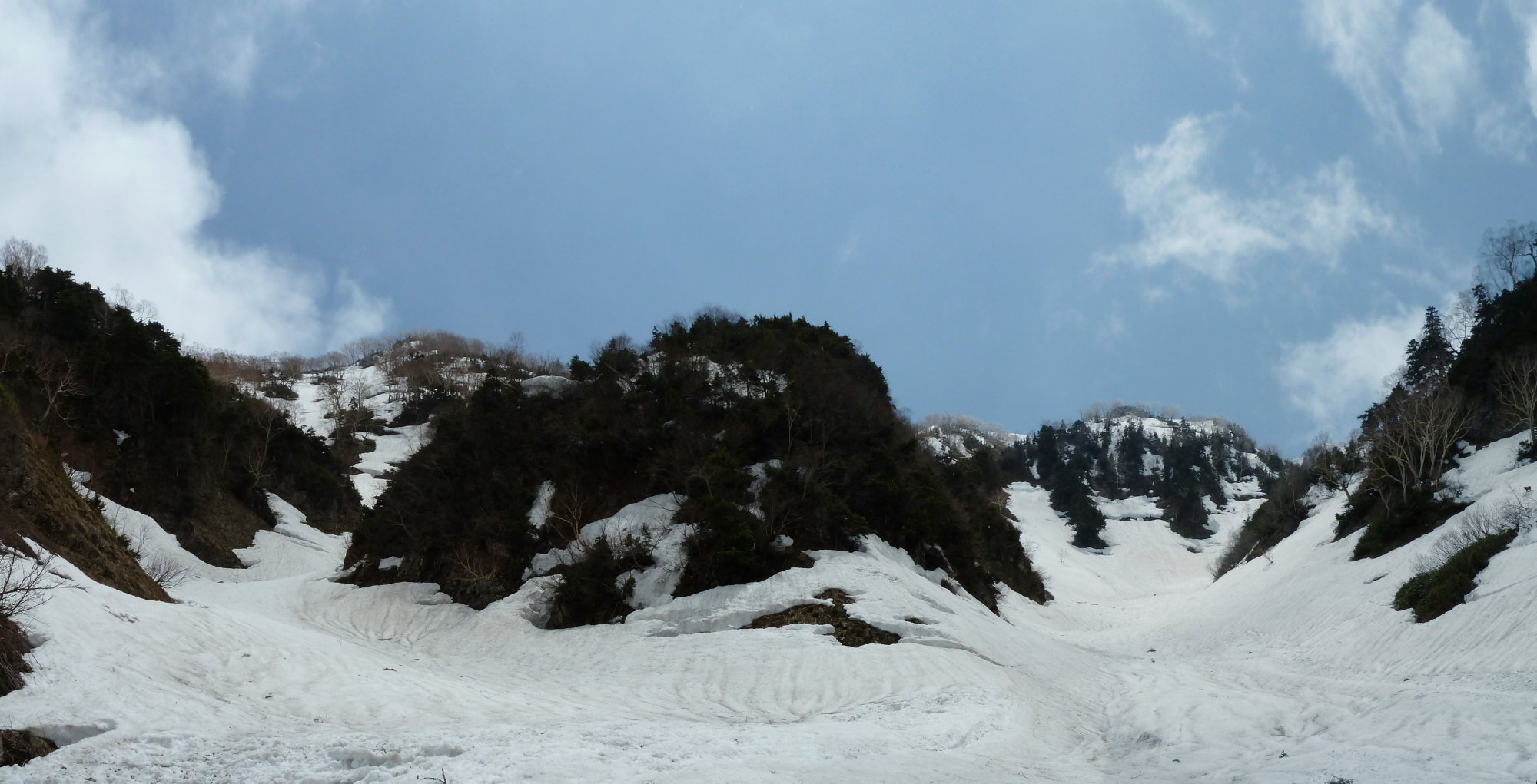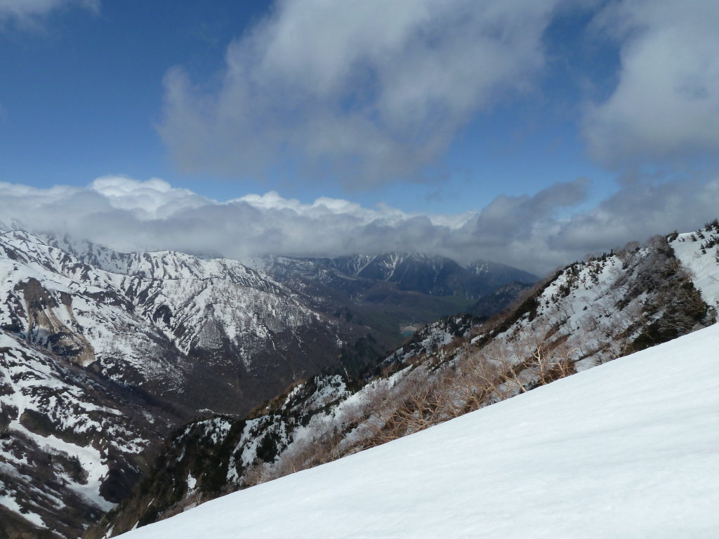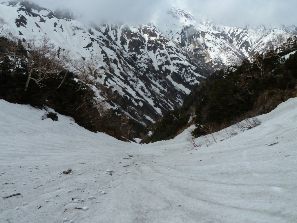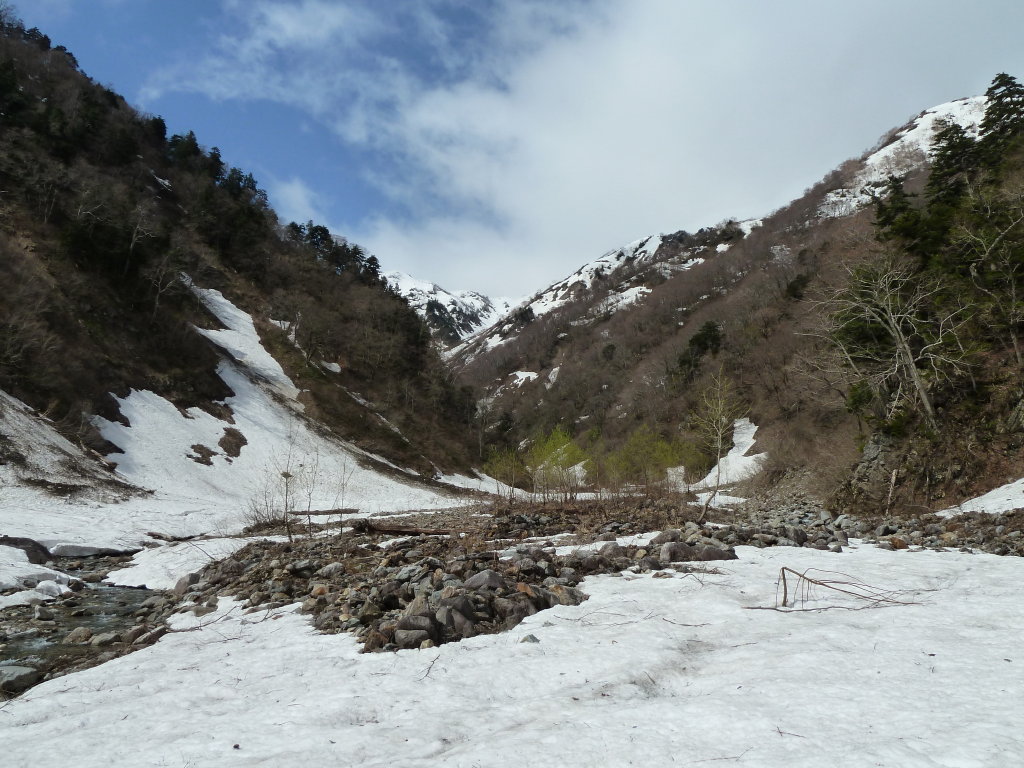いうのは長い登山経験の中でも初めてと言っていい不思議な感覚だった。しかも両岸の支谷には雪が詰まっている。