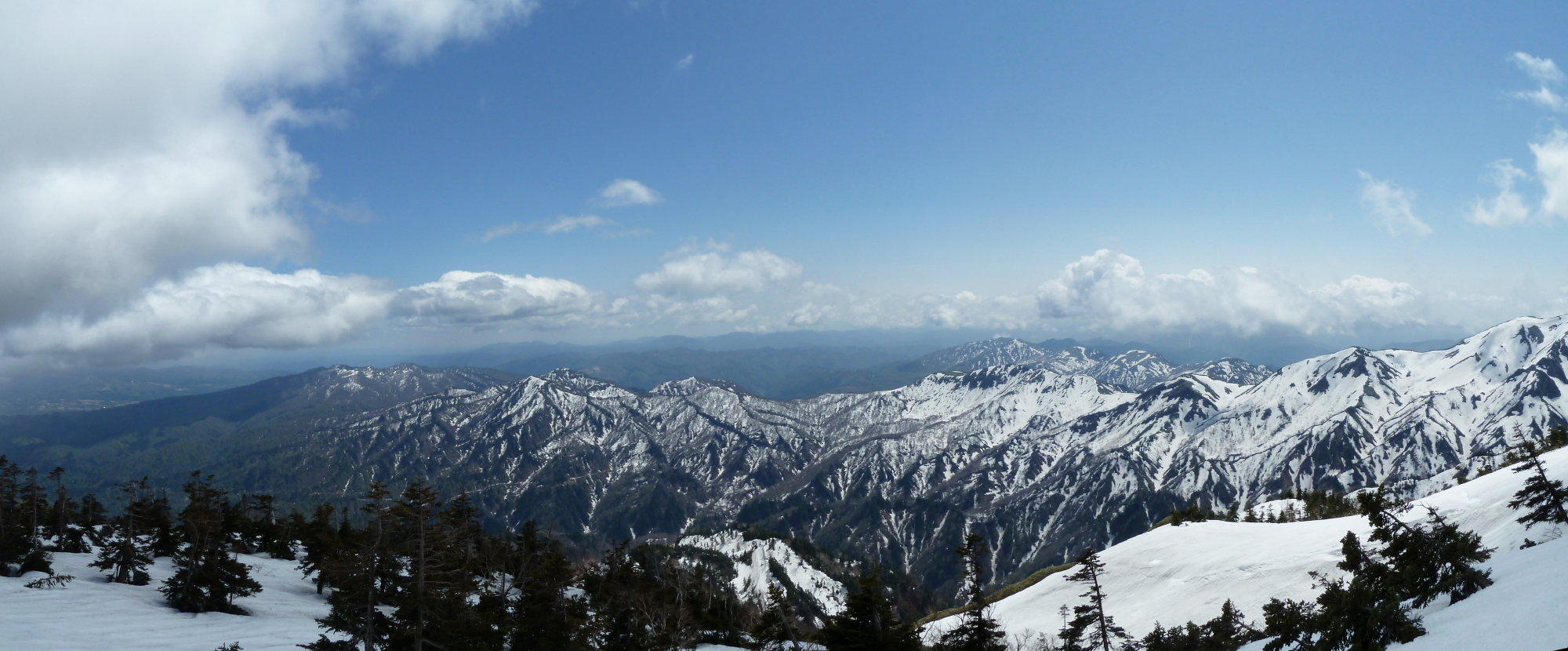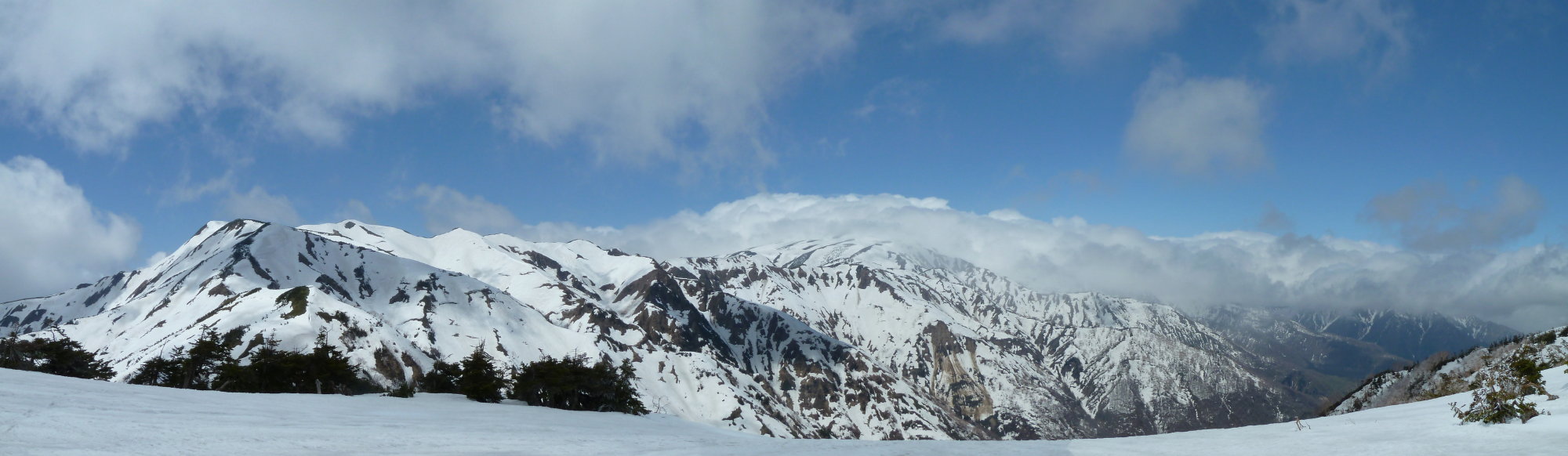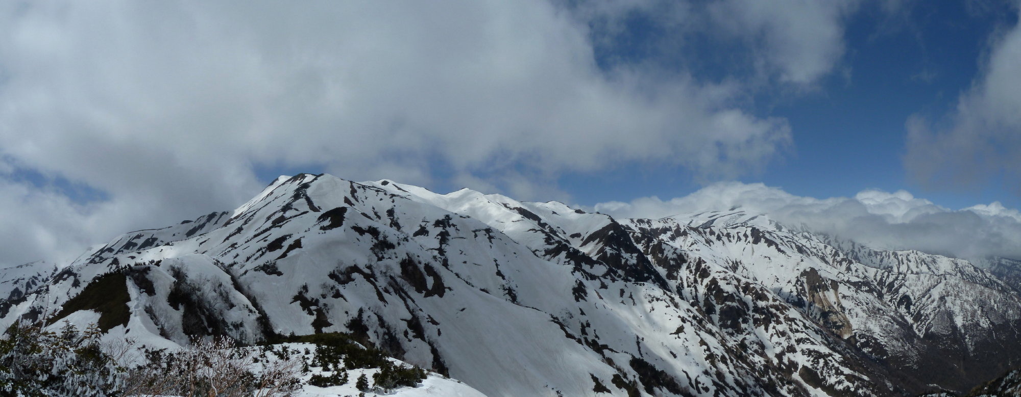 Ca1900mの最後の二俣。たんぽぽルートは左だが、右の雪渓の果てに浮かぶ真っ白な稜線とその上に広がる青空に心惹かれた。あそこまで登ろう。別山と南白山を結ぶ尾根にもまだしっかり雪が残っているようだ。