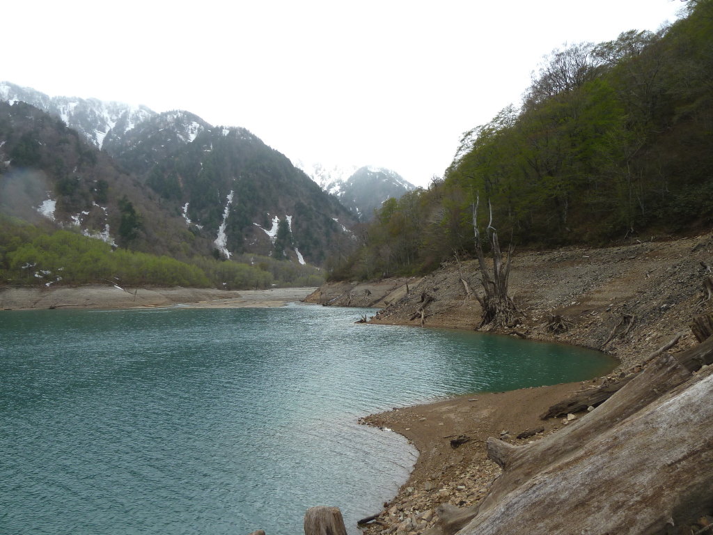 大小さまざまの石が積み重なった湖岸の斜面をトラバースして行く。20センチばかりの巾でそこはかとなくトレースがあるようなところもある。石は安定しておらず、不用意に足を踏み出すと、落石がガラガラッと音を立ててポシャンと湖水に転がった。湖畔には枯れた巨木のオブジェが並んで面白い。