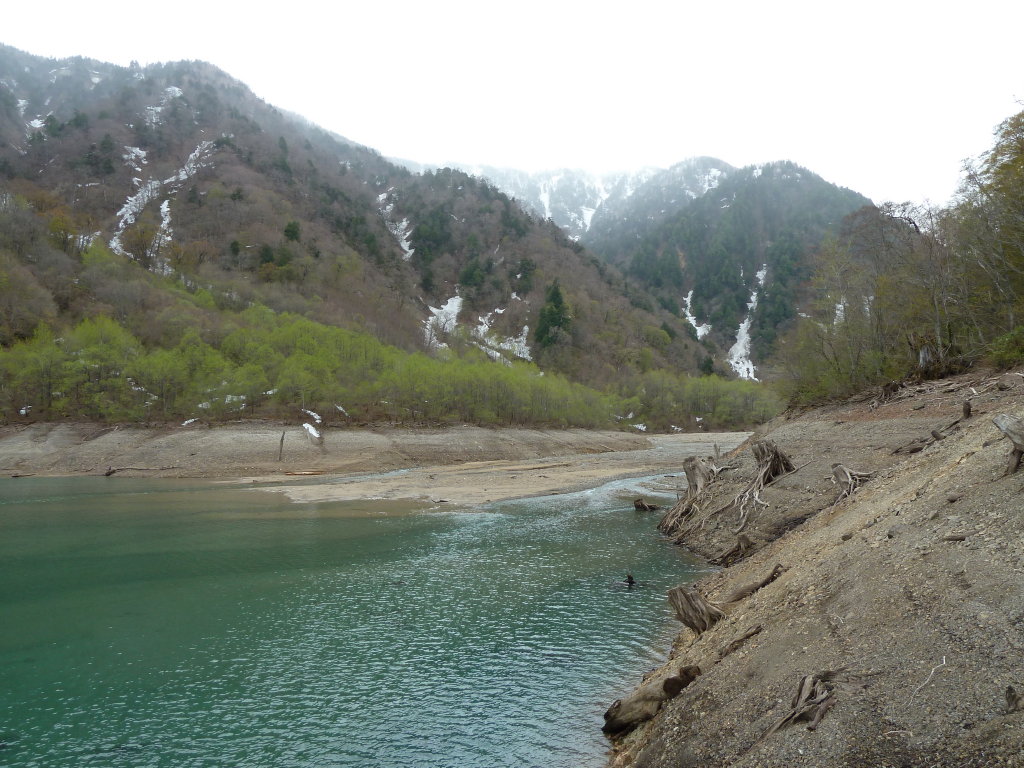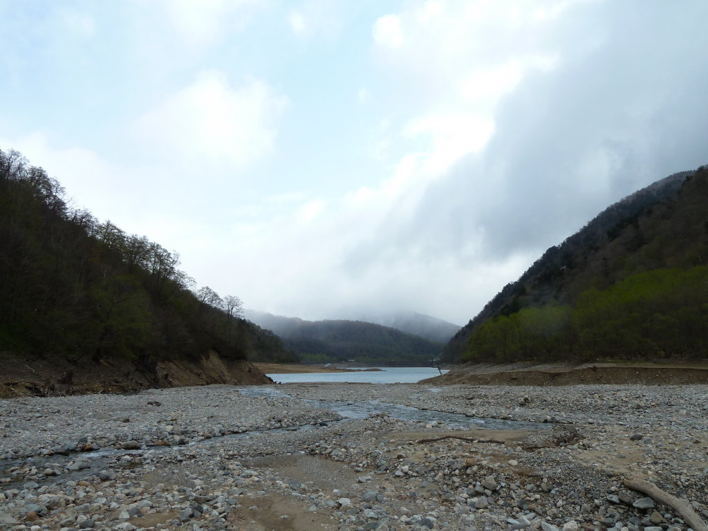 このあたりでは湯谷という名の谷は、巾200~300mの広々とした荒れ河原が続く。湖水を背にそんな広い河原を歩くと