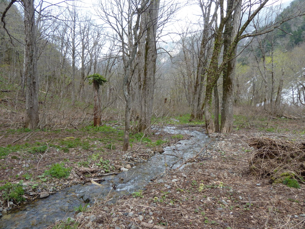 同じように河原を歩くのも芸がないので、左岸側にある樹林に入ってみると、そこは小さな流れの脇に湿地が点在する落ち着いた場所だった。河原のように石がゴロゴロしていないので格段に歩きやすい。山菜も豊富なようだがよく知らないのが残念だ。このルートを選んで正解だった。往路のほんの少し横を歩くだけでまったく違う雰囲気を味わうことができた。
