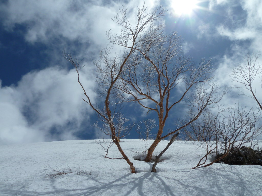 いよいよ傾斜が強まってきたが、どうしてもピッケルが欲しいという斜度でも雪質でもなく、ストックの2点支持で足場を交互に固めて行けば問題ない。頭上のダケカンバに光るのは霧氷だろうか。