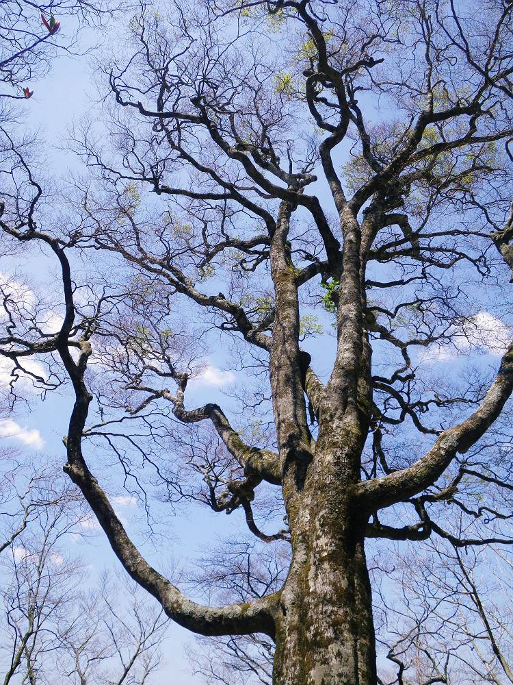 植林を抜けるとようやく天然林。二重山稜だ。1061尾根に乗ったのだろう。大木が暖かく迎えてくれる。モミやコメツガ、ミズナラの林を歩くとミツバツツジがちらほら。