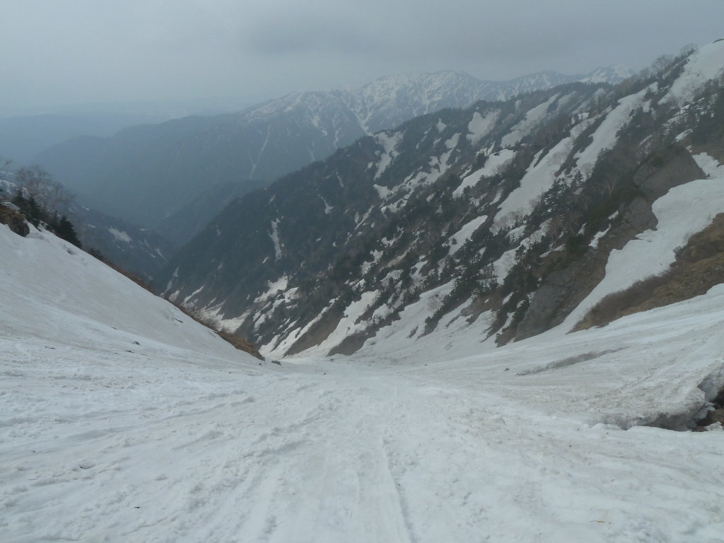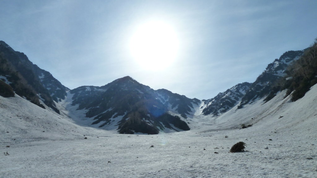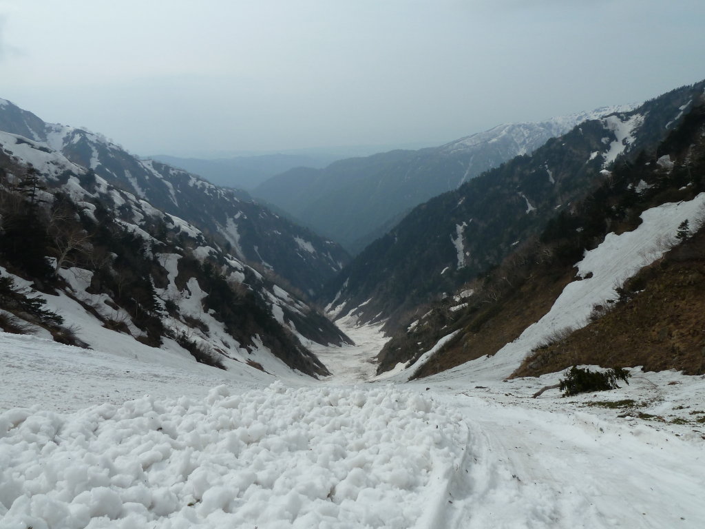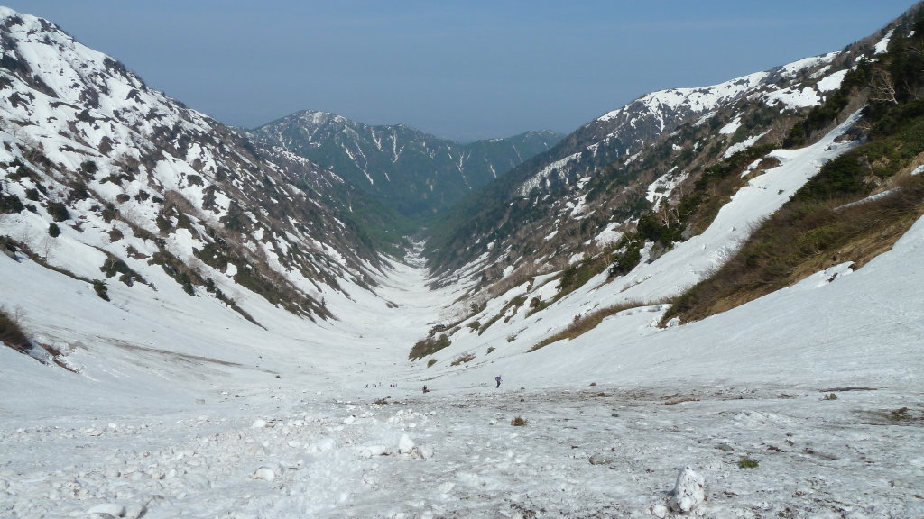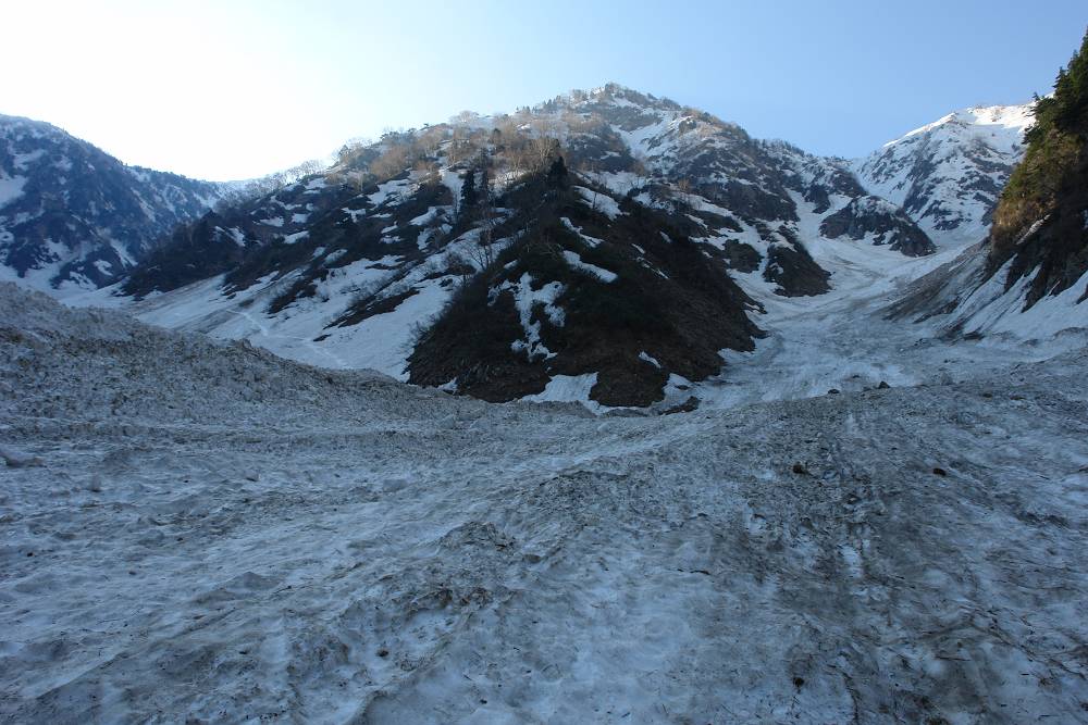 いい雪渓も珍しいだろう。谷幅も広く、まったく圧迫感のないスケールの大きな谷だ。これだけ広いとデブリも谷を埋め尽