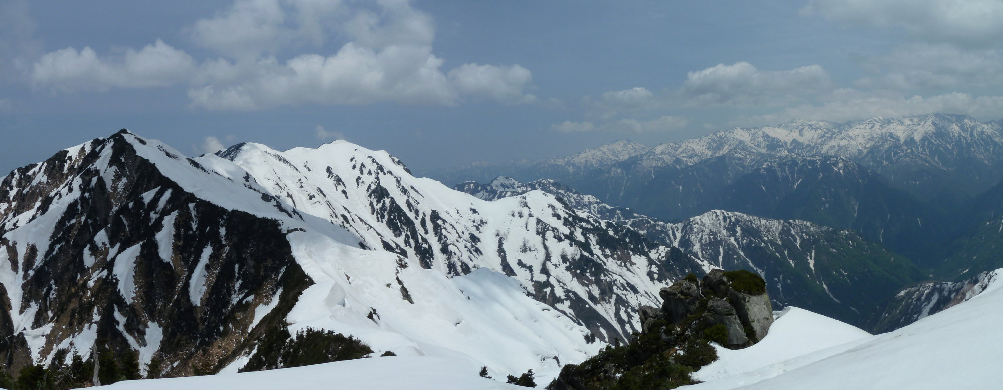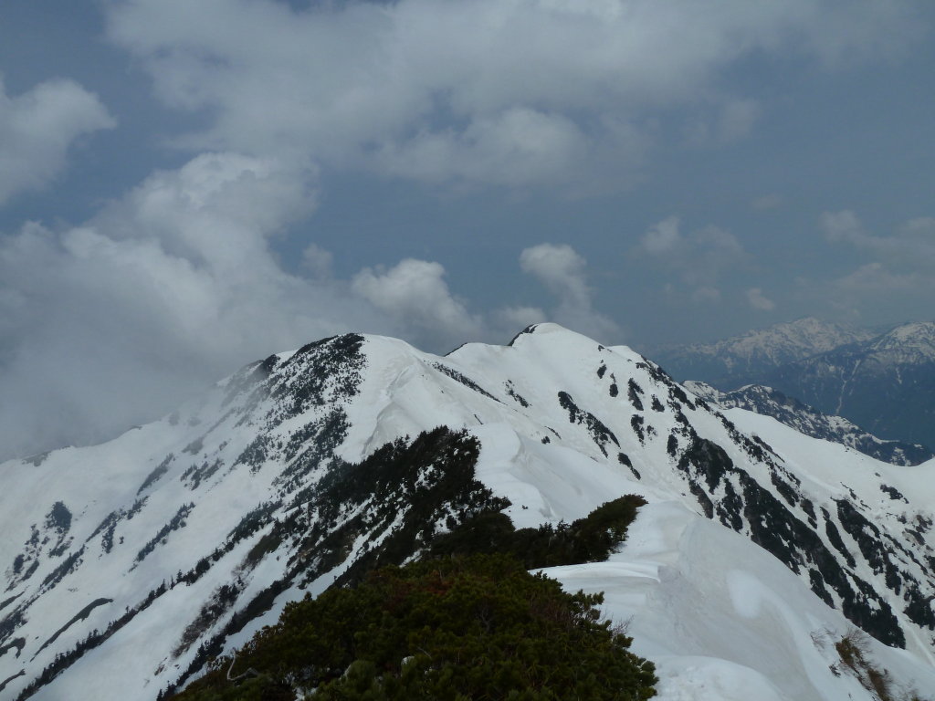 これから向かう釜谷山、毛勝山へと続く雪稜がおいでおいでと呼んでいるようだ。スキーヤーの話では2000m以上は雪が少ないということだった。こちらは初めてなのでこの雪が多いのか少ないのかわ