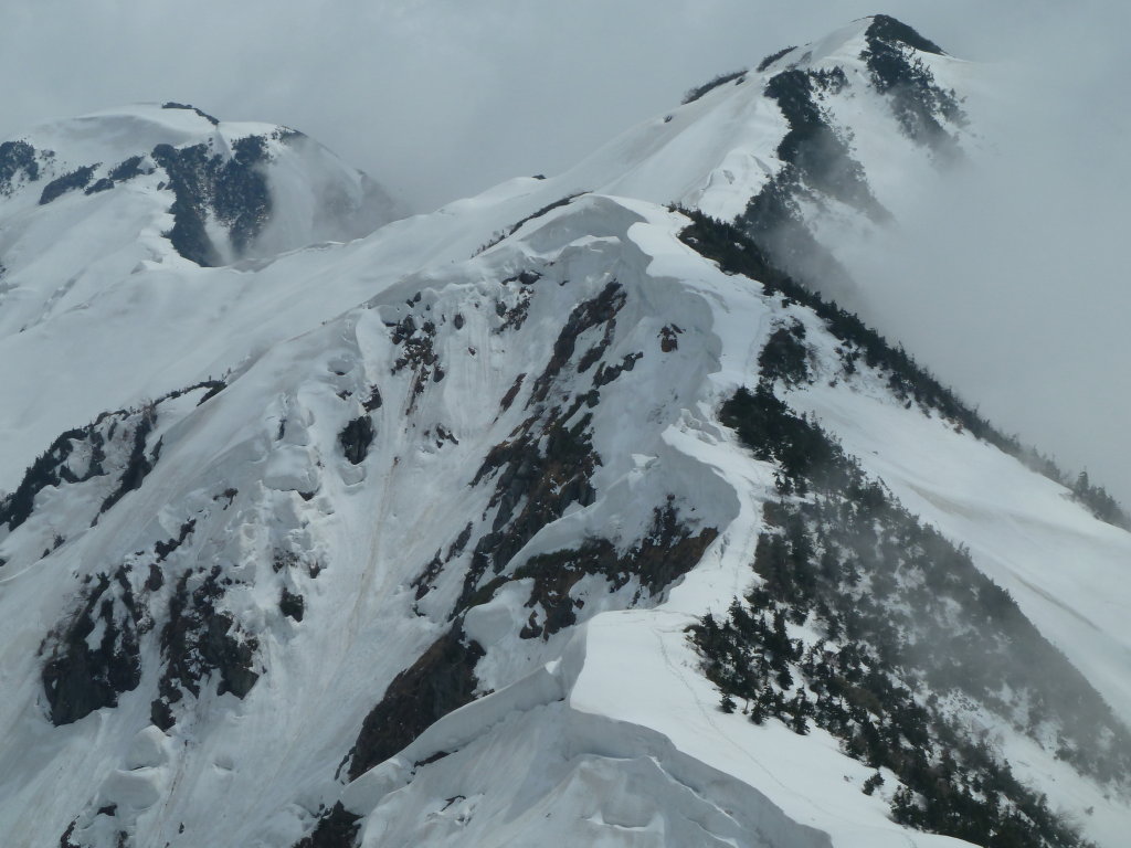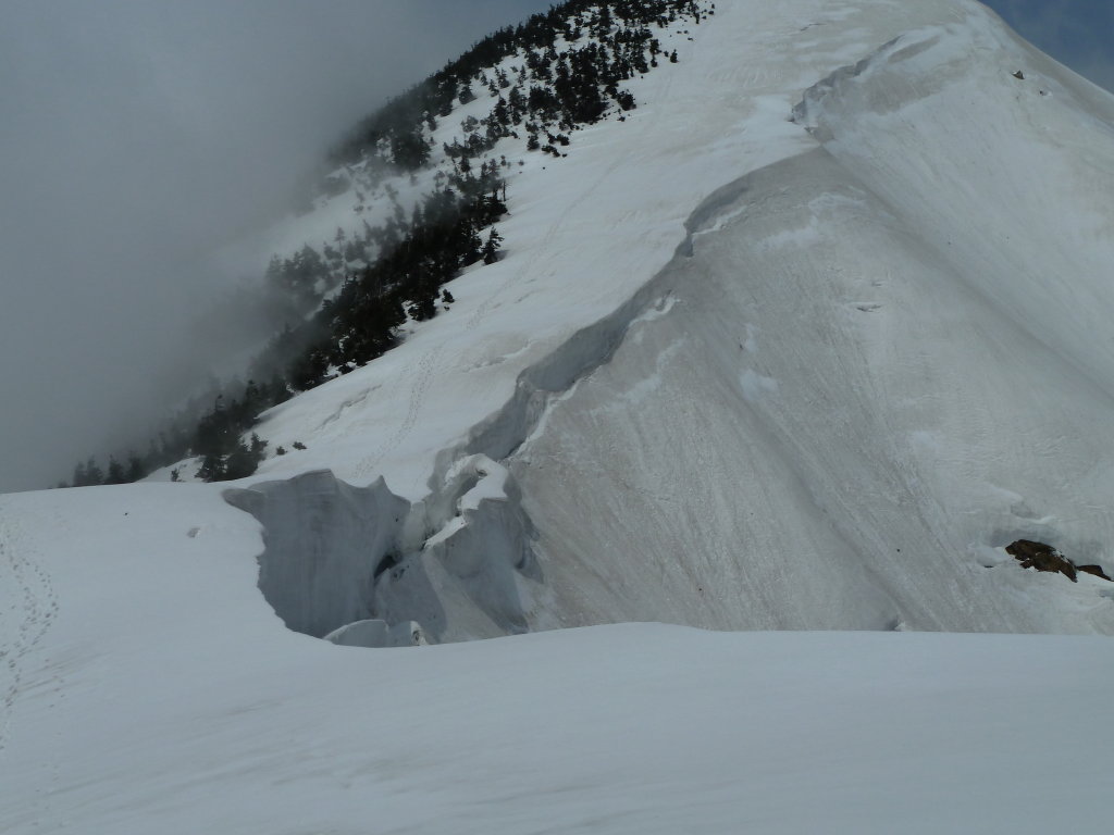 雪のトンネルのような場所を抜けて、かろうじて繋がった雪の橋を渡ったりしながら雪稜の端に出ると、雪庇が落ちた後