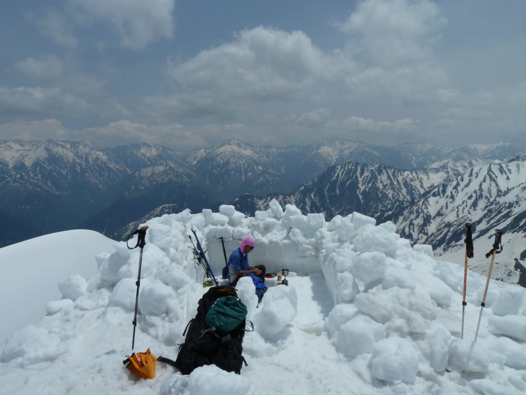 山頂にはすれ違ったパーティーが設営したのだろう、建て売りの分譲住宅かと見紛うきれいな半地下式の雪洞が残さ