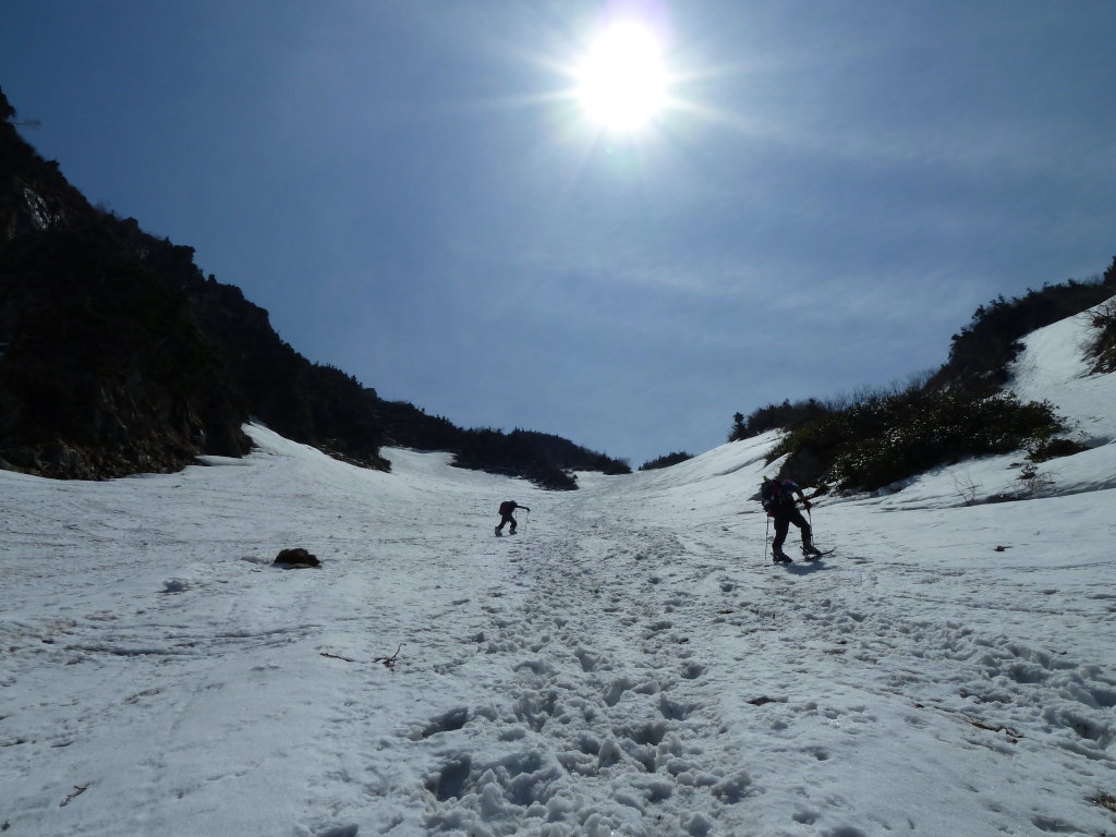 最終堰堤を越すと雪は完全に繋がり、目指す猫又山南のコルまで白い道が一直線に伸びている。これほど見通しのいい雪渓も珍しいだろう。谷幅も広く、