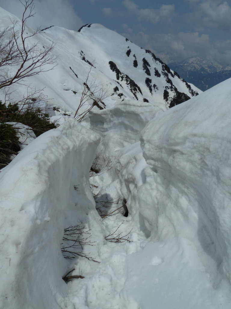 このあたりは雪割れもあって、ただ単純に尾根上を進むという感じではありませんでした。