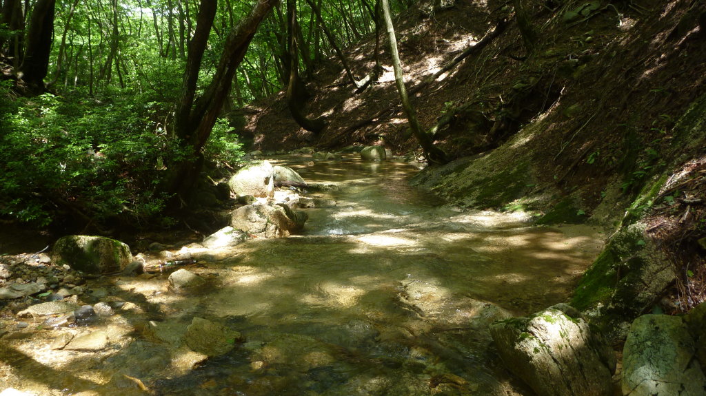 谷はすぐ緩やかになり、左右から毛細血管のように支流が集まってくる。木漏れ日の差す小台地に腰を降ろした。