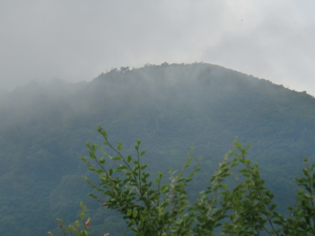 残念ながら、曇天で薄もやがかかり、ピークは見えない。