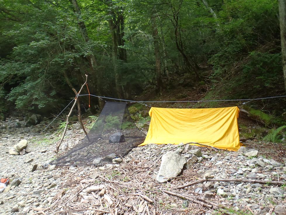 喜平小屋谷出合にツエルトとモスキートネットを張る。モスキートネットの中にブトも一緒に入れてしまったよ。カユイ~。