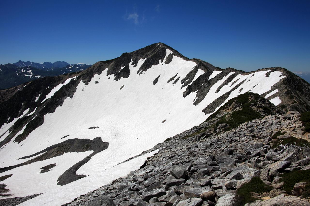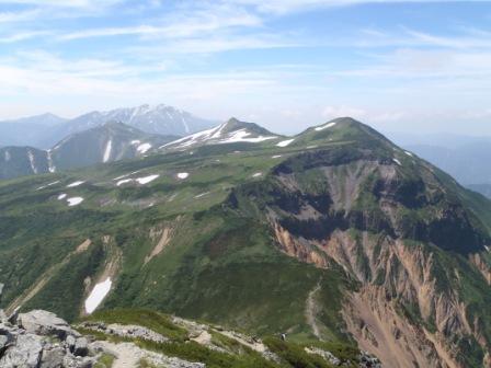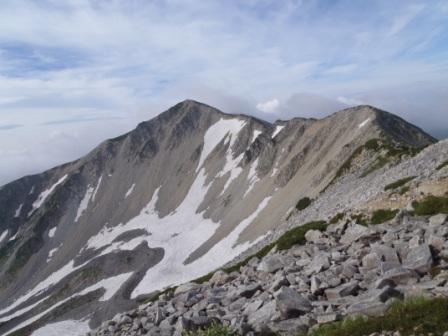 私が登ったのは7月中旬だったので、北薬師岳から薬師岳を眺めたときには、カールにかなり雪が残っていて、なかなかよかった