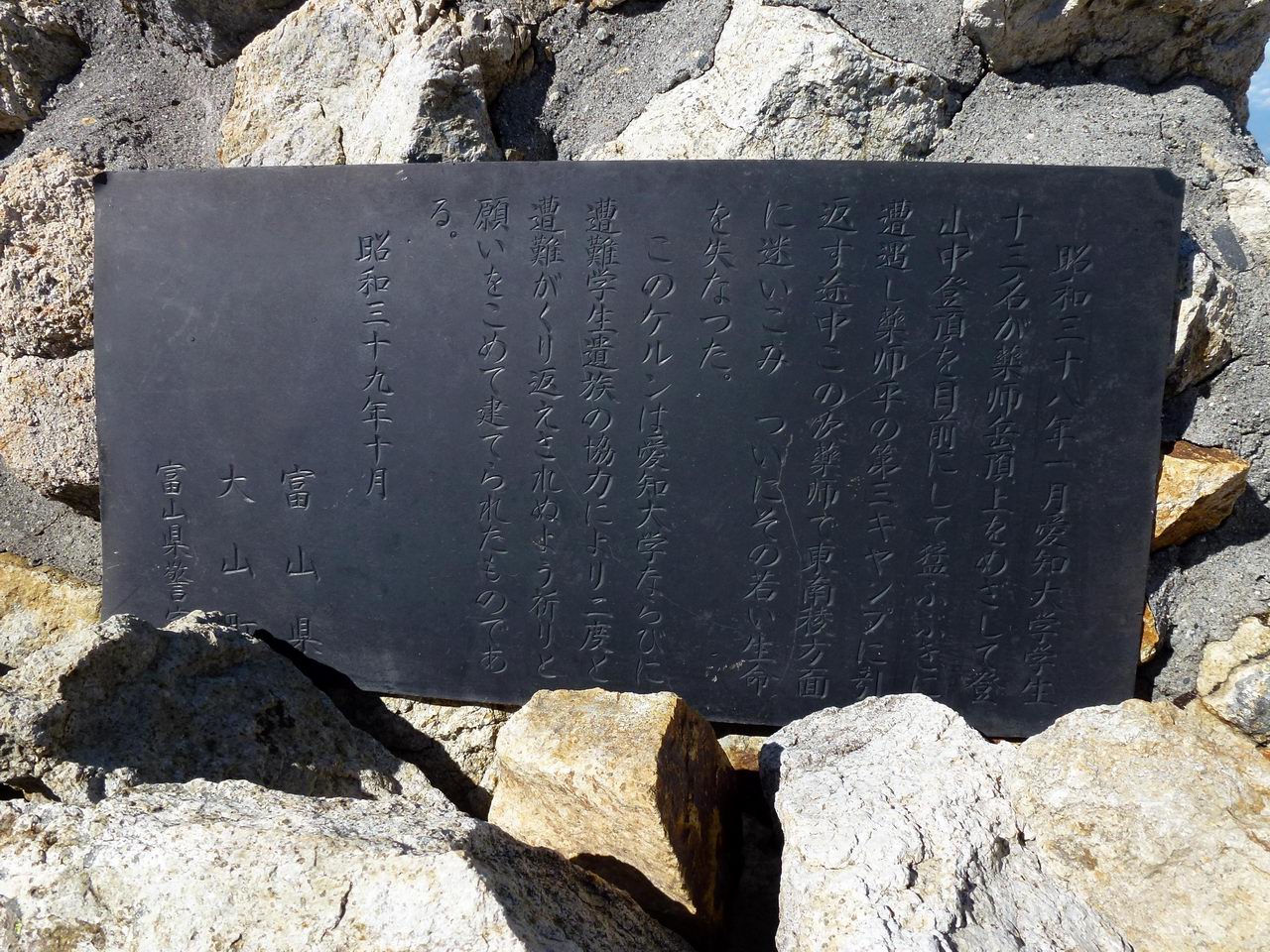 ンがありましたが、これも愛知大の遭難事故の慰霊碑になっています。あと、避難小屋跡にもケルンがあり、これにも慰霊の銘板がありま