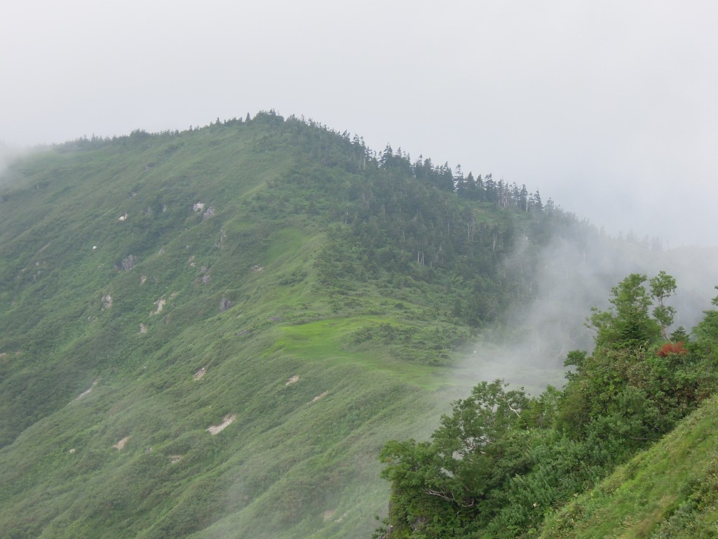 そして此処からさらに大戸沢岳、会津駒に続く稜線を見ると湿原が点々と続いているのが見てとれる。あそこを伝って歩いて行けたら面白いだろうなあとは思うが、目の前にある藪はちょっとやそっとではその希望をかなえてくれないような気がする。ネットで見ても
