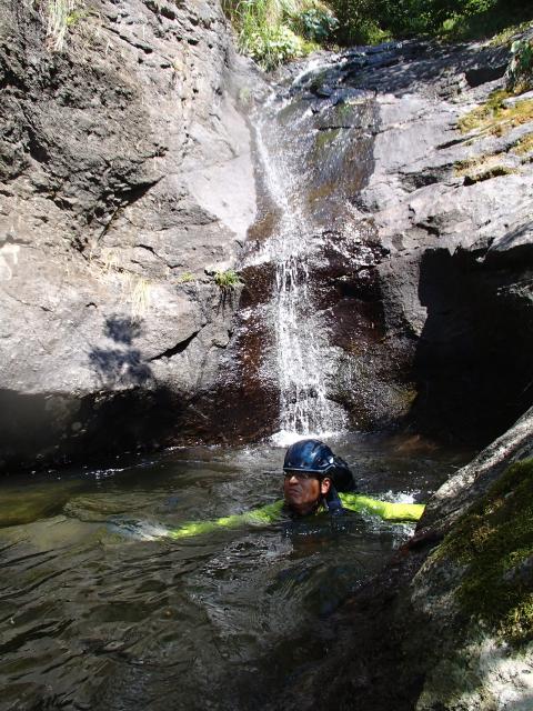 水量的に今日は泳ぎまではないだろうと勝手に思っていたのだが、岩に穿たれたお風呂屋さんサイズの釜に行き当たる。敏さんに先行ってと言われ、じゃぶじゃぶ入っていくと 意外と深い!!それまで水はせいぜい腰位までだったのが、へたをすると足が届かない。