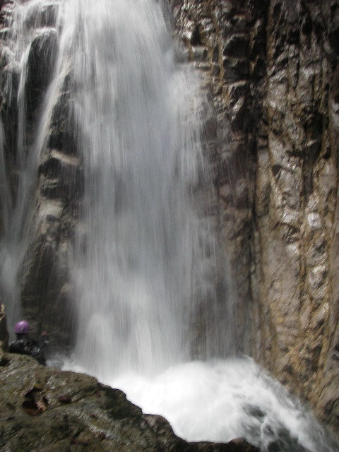 核心部の8m斜滝にきた。ここだけはアルキメデスの原則を守っていては通過できないので覚悟を決めて泳ぐ。昨年は滝壺側に吸い込まれて国際救助隊のロープに引張ってもらうという失態を演じたので滝壺側に寄り過ぎないようにして滝の左側に取り付いた。
