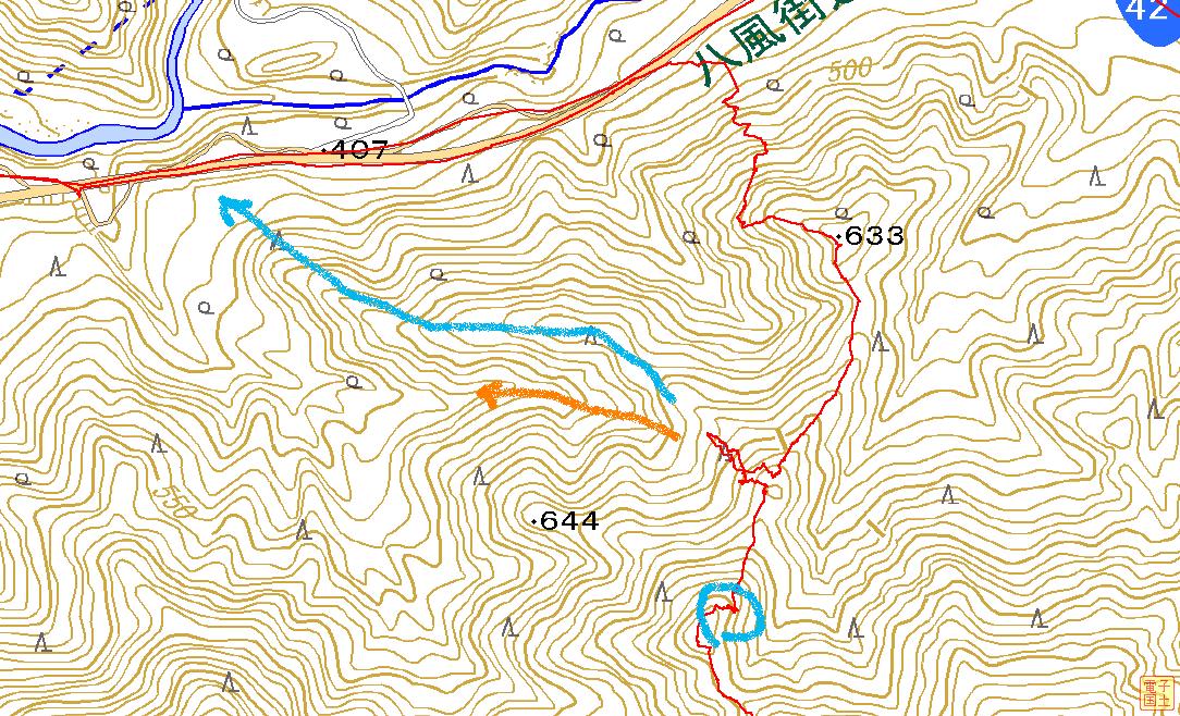 下りは国道に633に向かう尾根に乗って茨川の橋が通る辺りに出る予定だったが途中で尾根を外したのが分かったので(尾根が沈みこんでいた)難儀して隣の尾根に乗り換えた。