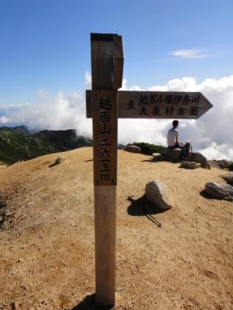やっとの思いで越百山頂に立った。今日は晴れているもののかなり雲が多く、御岳も見えない。南アルプスも鋸あたり