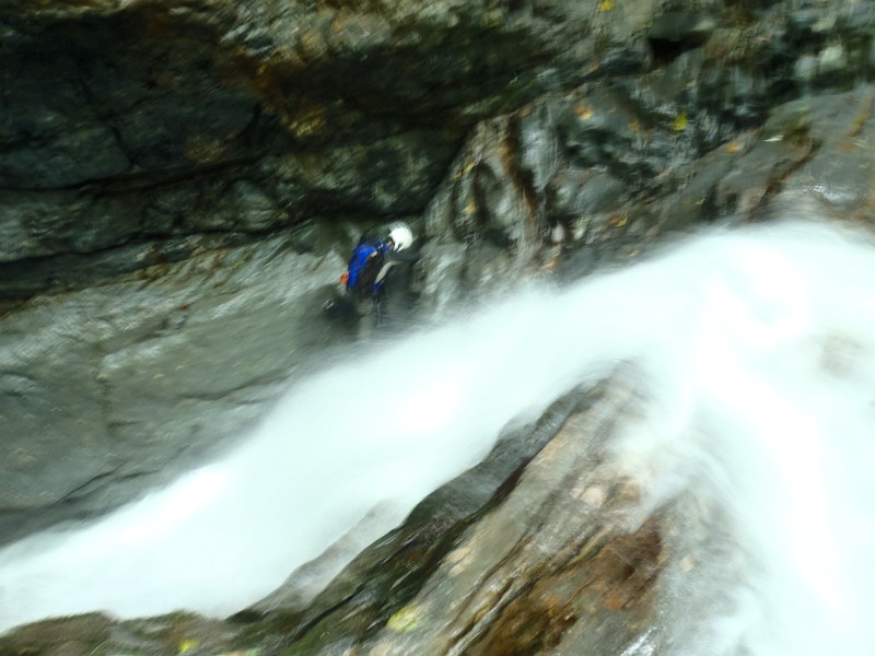 楽そうな滝身のホールドを使おうとすると結構な水圧で流されてしまいそうだ。斜瀑の中の岩にぶつかり落ちる水流を見ていると、水量は同じでも水圧は場所によって違うことがよ~くわかった。そういうところを選んで登っていく。
